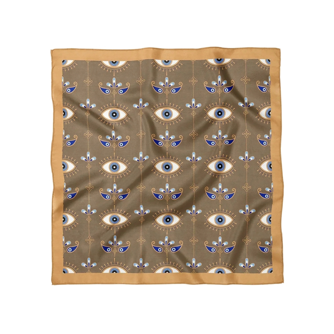 50×50 cm ölçülerinde, haki-bej zemin üzerine mavi ve altın tonlarında göz desenleriyle tasarlanmış, sarı-hardal kenarlı ipek saten fular. Mistik ve sofistike havasıyla kombinlerinize zarif bir dokunuş katar.