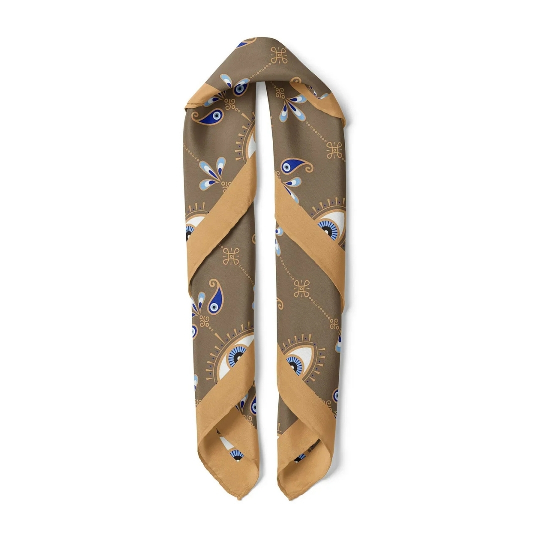 Haki-Bej Göz Desenli İpek Saten Fular – Mistik ve Zarif Bir Dokunuş