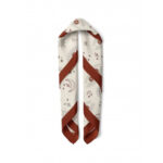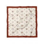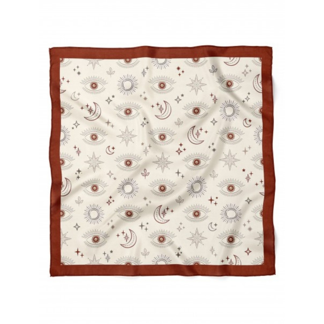 50×50 cm ölçülerinde, kahverengi kenarlı ve bej zemin üzerine kahverengi göz, güneş, ay ve yıldız motifleriyle tasarlanmış özel üretim ipek saten fular. Şıklığı, sıcak tonları ve zarif dokusuyla kombinlerinize sofistike bir hava katar.