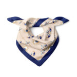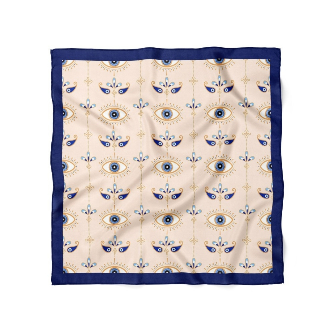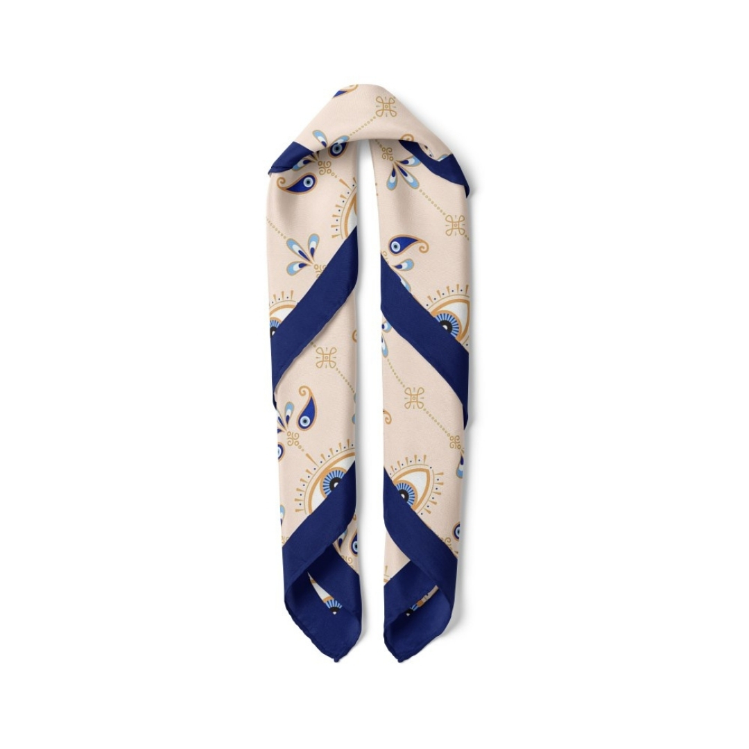 50×50 cm ölçülerinde, lacivert kenarlı ve krem zemin üzerine göz ve motif desenleriyle tasarlanmış ipek saten fular. Klasik ve modern çizgilerin birleşimiyle kombinlerinize sofistike bir hava katar.