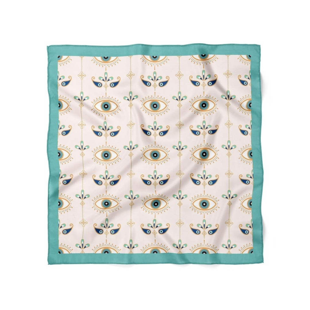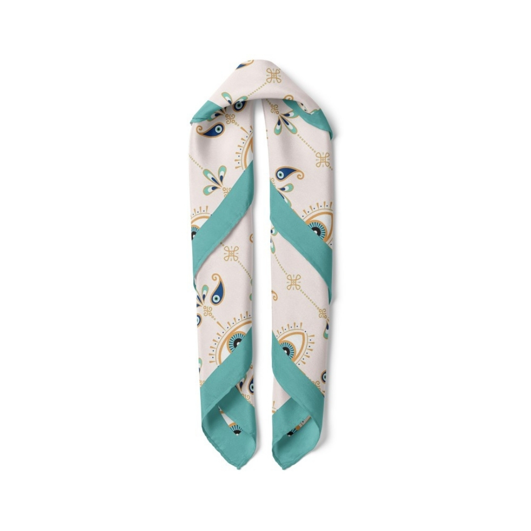 Özel üretim polyester ipek saten kumaştan hazırlanan bu fular, krem zemin üzerinde işlenen göz motifleri ve simetrik desenleriyle dikkat çekiyor. Turkuaz kenarı, tasarıma hem taze hem de göz alıcı bir görünüm kazandırıyor. Günlük kombinlerde zarif bir tamamlayıcı, özel günlerde ise sofistike bir aksesuar olarak öne çıkar.