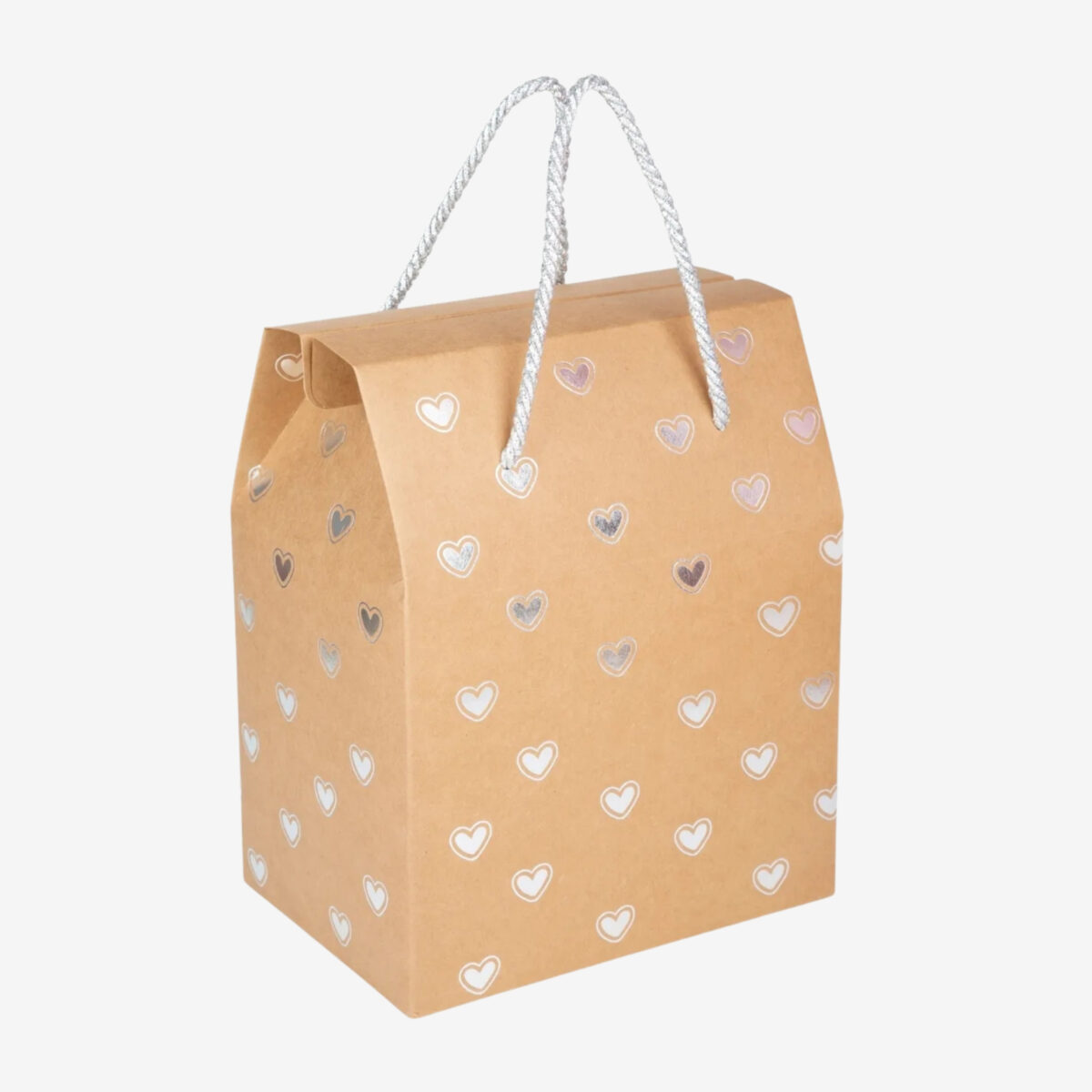 🎨 Tasarım: Kraft zemin üzerine gri kalp desenleri, lokal parlak selefon dokunuşlar
