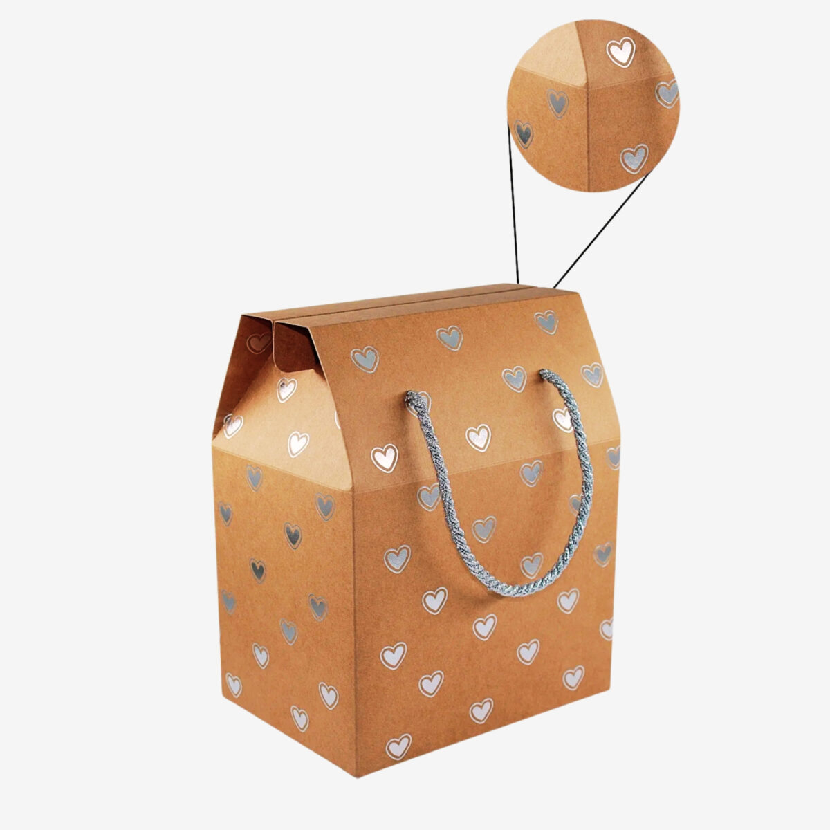 Minimalist doğallığın romantik bir dokunuşla buluştuğu Gri Kalpli Kraft hediye kutusu, kraft zemin üzerindeki zarif gri kalp desenleriyle sade ama etkileyici bir görünüm sunar. Doğal dokusu sayesinde çevre dostu bir duruş sergilerken, tasarımıyla da sevgi temalı sunumlara şıklık katar. Özellikle Sevgililer Günü, nişan, yıldönümü veya butik hediye projeleri için ideal bir tercihtir.