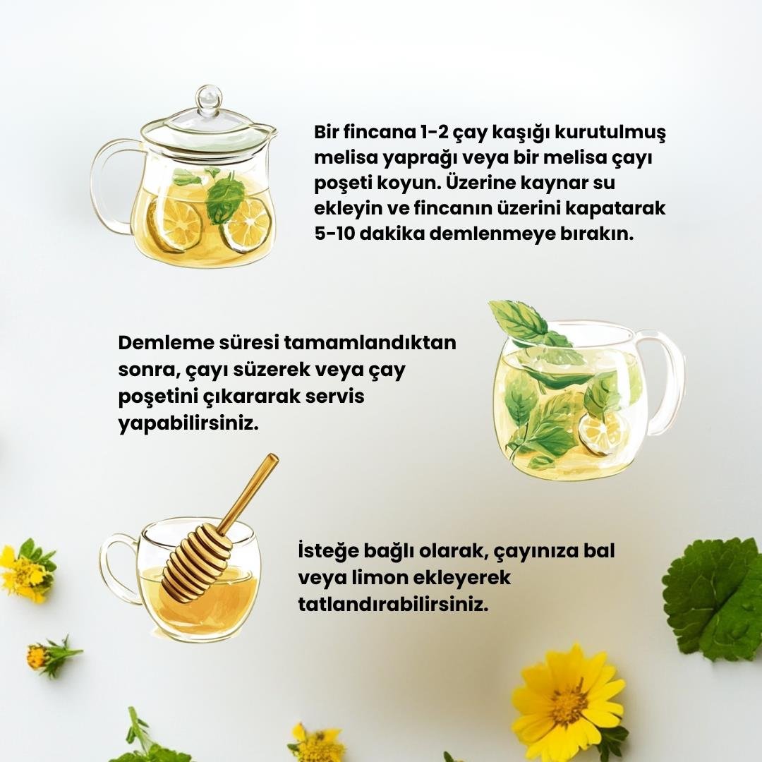 Bir fincan için 1 tatlı kaşığı melisa yaprağını sıcak suya ekleyin, 5–10 dakika demlenmeye bırakın. Bal veya limonla tatlandırarak daha keyifli hale getirebilirsiniz.