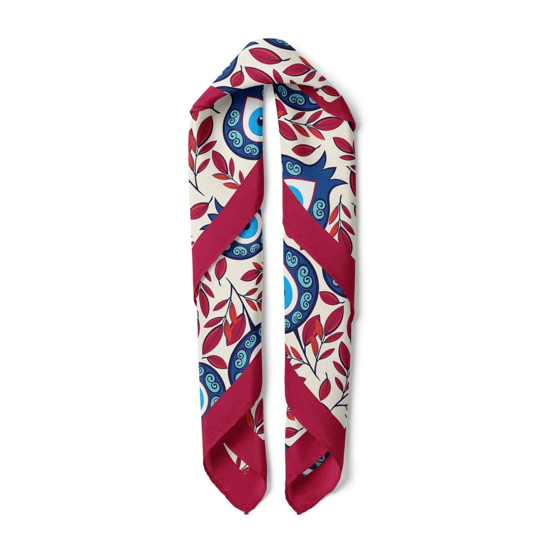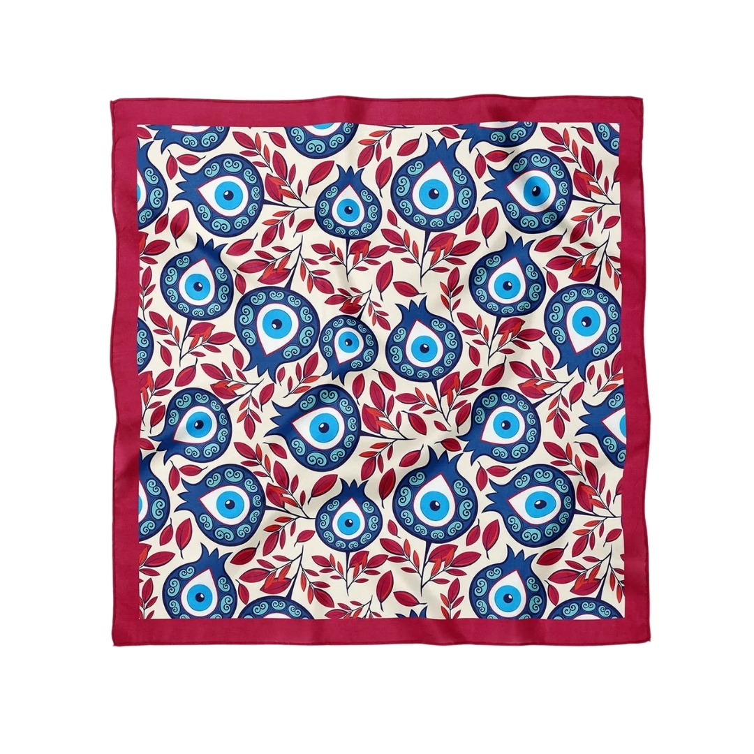 Bordo Kenarlı Nazar Boncuğu ve Nar Desenli İpek Saten Fular – Uğur ve Zarafetin Buluşması