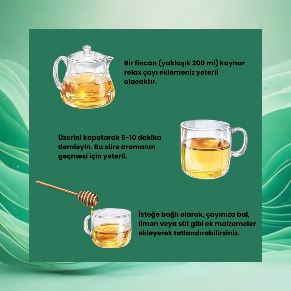 Bir fincan için 1 tatlı kaşığı Relax Çayı’nı sıcak suya ekleyin, 7–10 dakika demleyin. Dilerseniz bal ile tatlandırabilirsiniz. Gün sonunda dinlenirken, kitap okurken veya uyku öncesinde huzurlu bir ritüel olarak tercih edebilirsiniz.
