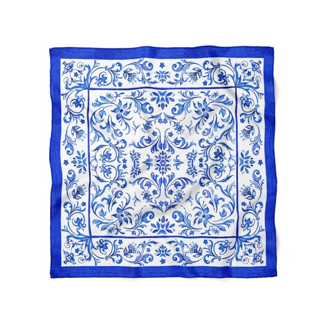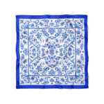 50×50 cm ölçülerinde, beyaz zemin üzerine mavi sarmaşık ve çiçek desenleriyle tasarlanmış ipek saten fular. Zarif ve klasik havasıyla her kombine sofistike bir dokunuş katar.