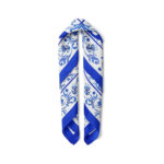 Özel üretim polyester ipek saten kumaştan hazırlanan bu fular, beyaz zemin üzerinde mavi tonlarında işlenen sarmaşık ve çiçek desenleriyle göz alıcı bir şıklık sunuyor. Mavi çerçevesiyle tamamlanan tasarım, hem günlük kombinlerde hem de özel davetlerde sofistike bir tarz yaratır.